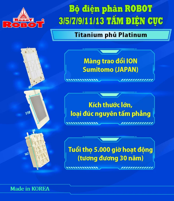 Máy lọc nước điện giải iON kiềm ROBOT tự hào là sản phẩm Thế Hệ Mới công nghệ tiên tiến Korea, hệ thống lọc cao cấp & các tấm điện cực bằng Titanium phủ Platinum dạng đúc nguyên tấm phẳng kích thước lớn nhất sản xuất tại Korea, an toàn tuyệt đối cho sức khỏe.